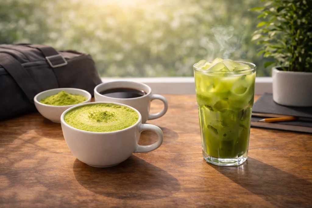 Matcha Green Tea and Green Coffee blend featuring matcha green tea, matcha powder, and matcha green coffee in convenient matcha green tea bags. Enjoy matcha tea hot or iced, create a matcha green tea latte, explore matcha green tea benefits, and experience best matcha powder quality.