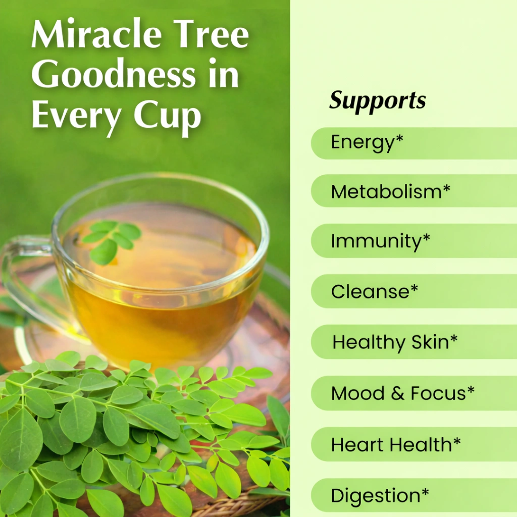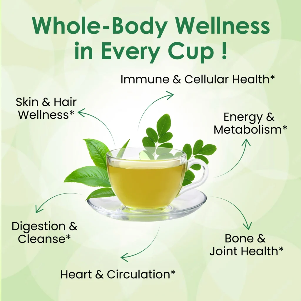 Moringa & Matcha Tea is rich in vitamins, minerals, and antioxidants. It supports immune health, helps detoxify the body, and provides natural energy without artificial stimulants.