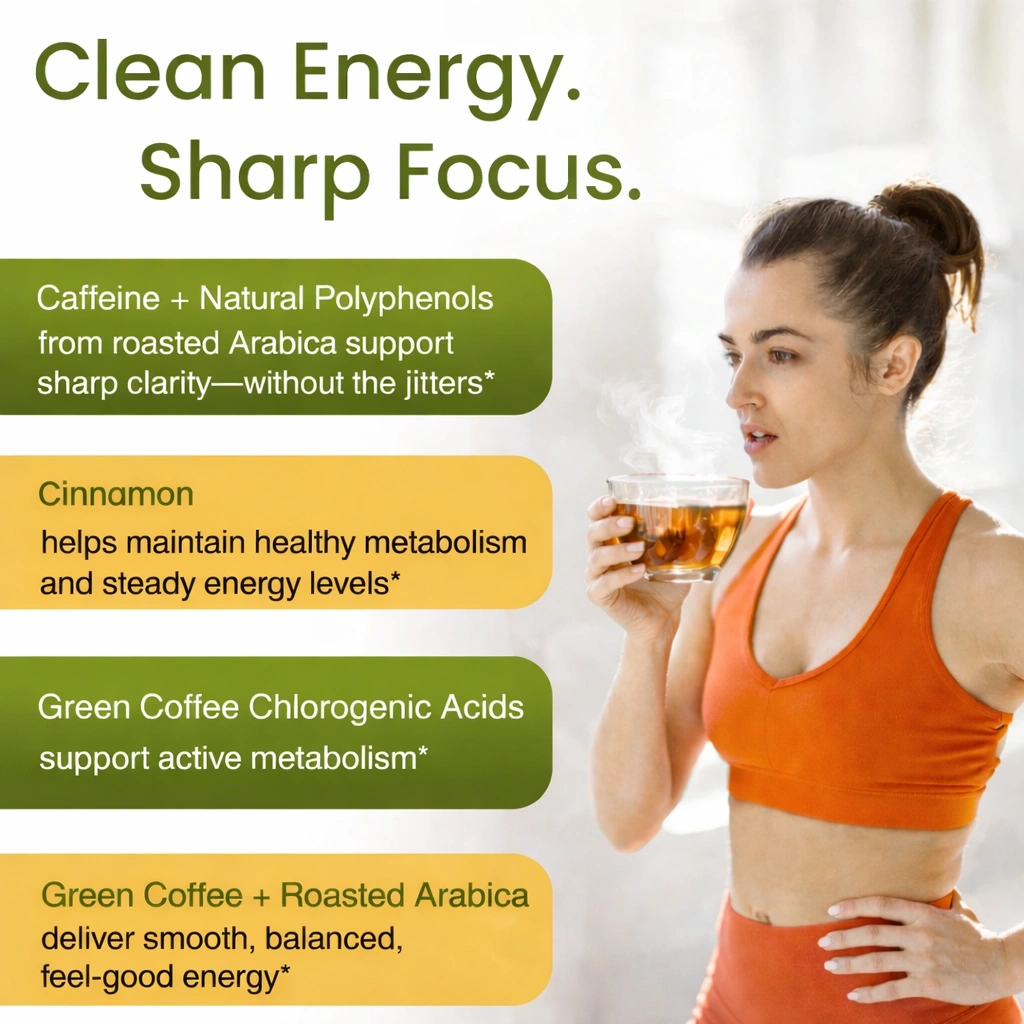 Matcha Green Tea & Green Coffee combines antioxidants from matcha with the natural energy boost of green coffee. It may help improve focus, support metabolism, and provide sustained energy throughout the day.